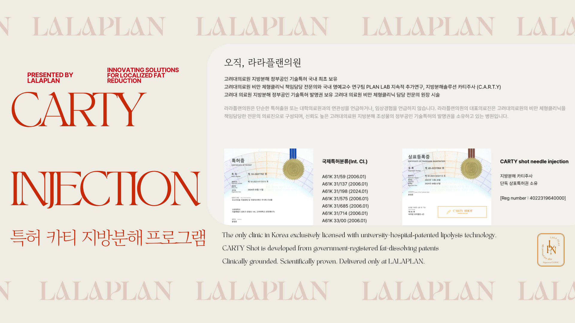 • 대학의료원 지방분해 기술특허 발명권 소장 병원, 라라플랜의원 연구진만의 노하우를 바탕으로 부위별·개인별 최적화된 맞춤 지방분해 솔루션을 섬세하게 제공합니다♡